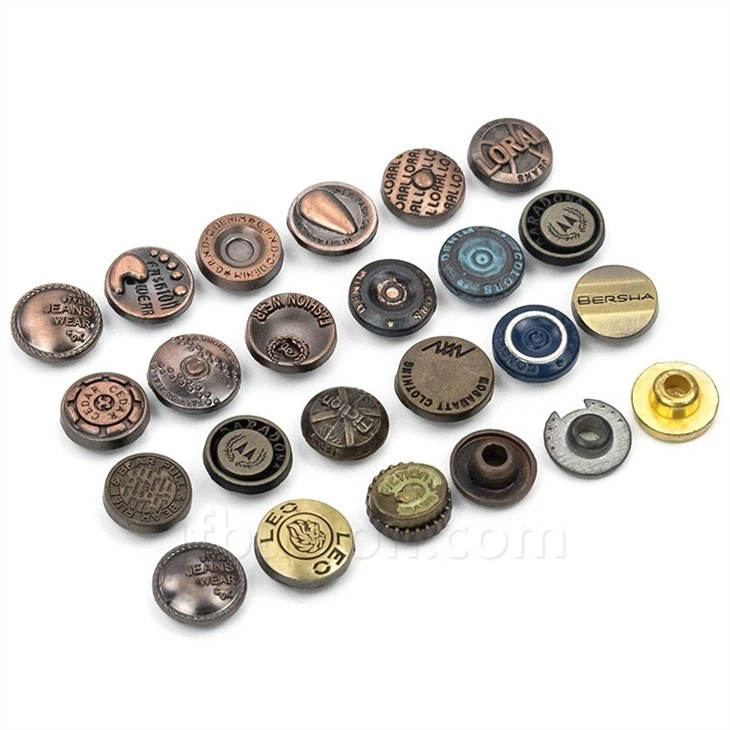 ジーンズのリベットの主な素材は、銅、亜鉛合金、鉄、アルミニウムなどですが、亜鉛合金と銅が最も一般的な素材です。 ボタンの金属加工素材や色が異なります。 それから、ブロンズ、アンティークブロンズなどがあります。